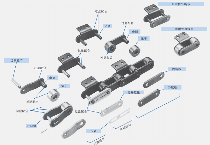 帶卡簧的連接鏈節(jié)通常用于小滾子鏈(節(jié)距最大25.40mm)。帶開口銷或定位銷的連接鏈節(jié)多用于較大的滾子鏈。