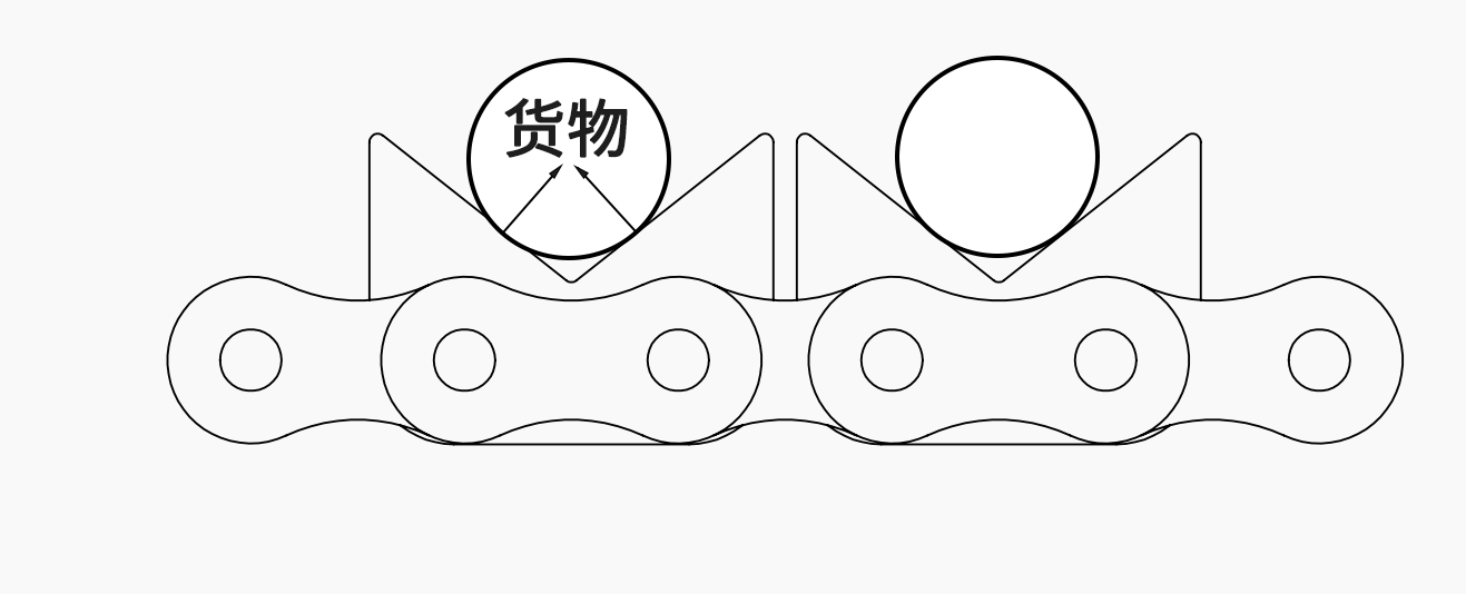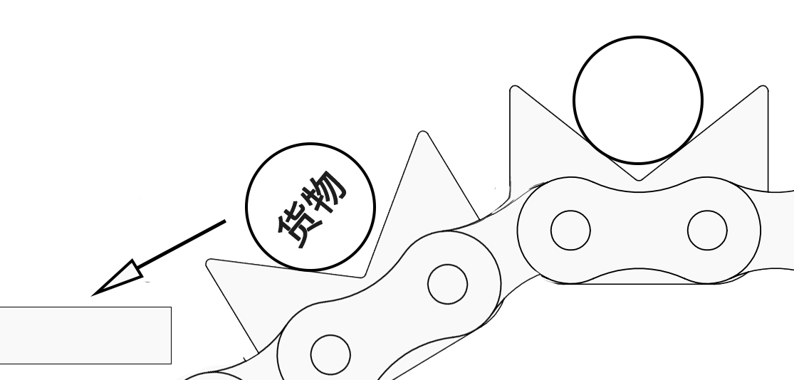 插板鏈的附件的“V”字型凹槽可卡住像安瓿瓶這類(lèi)圓柱形貨物讓其無(wú)法自由移動(dòng),然后隨著鏈條的移動(dòng)將其運(yùn)輸。