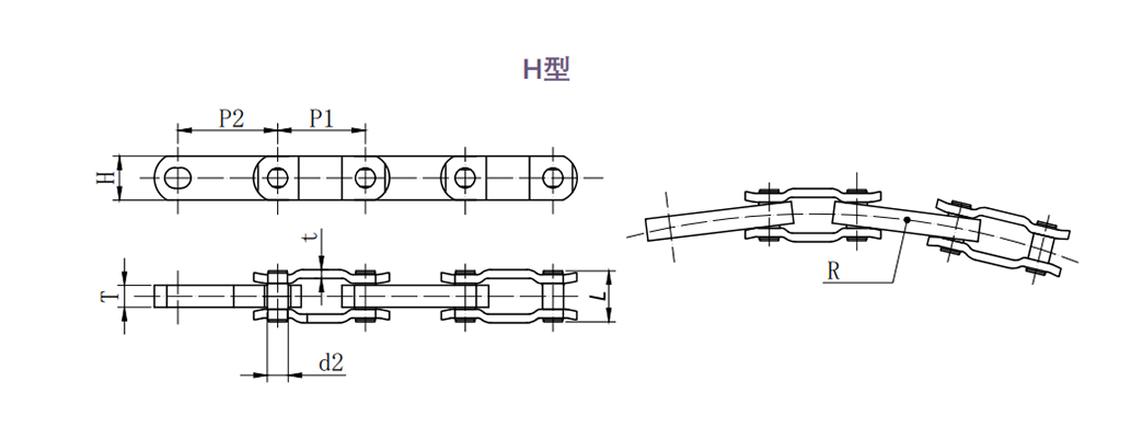 鏈條的外鏈板為折彎形狀,內(nèi)鏈板通過鍛造而成,通過特殊的設(shè)計使得鏈條可以在兩個平面旋轉(zhuǎn)運輸或沿多個方向運輸。