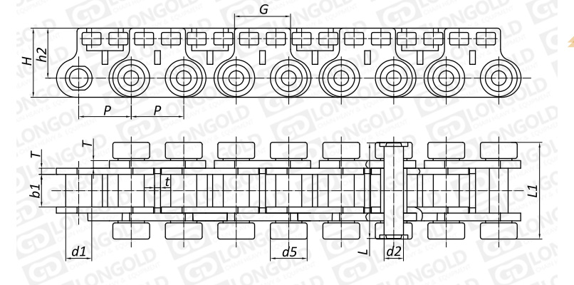 鏈條兩側(cè)帶側(cè)滾輪,其結(jié)構(gòu)類似于側(cè)置滾子鏈條,用于人造板材設(shè)備輸送線。