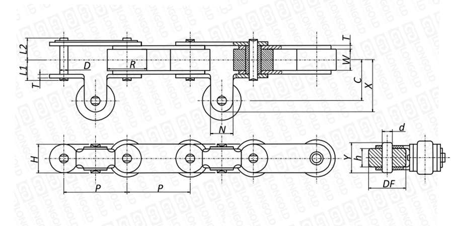 上圖為不銹鋼帶導(dǎo)輪雙節(jié)距輸送鏈的結(jié)構(gòu)圖。