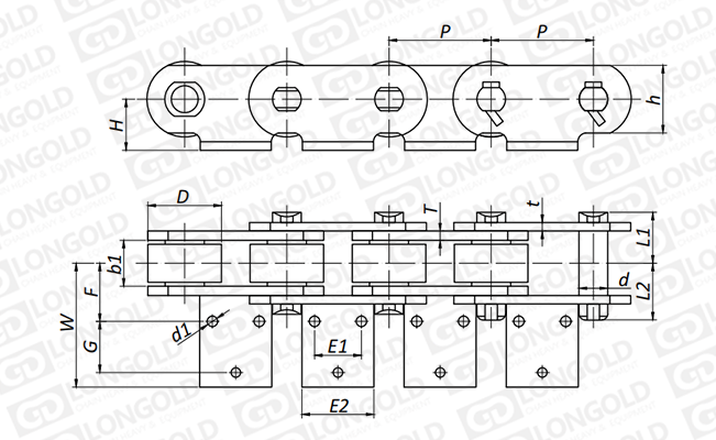 附件可配裝在每一個(gè)鏈節(jié)以上的鏈節(jié)間隔,如每偶數(shù)鏈節(jié)安裝,為了容易進(jìn)行保養(yǎng),安裝在外鏈節(jié)。