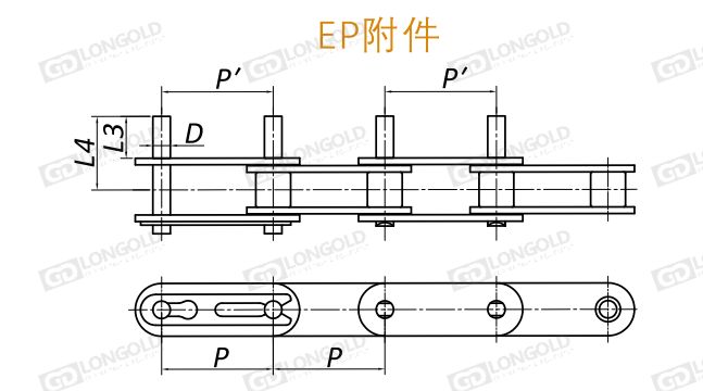 EP附件,鏈條的一側(cè)銷軸延伸的形式,這種形式的附件,可以在延長的銷軸部分根據(jù)客戶的需求做非標(biāo)加工。