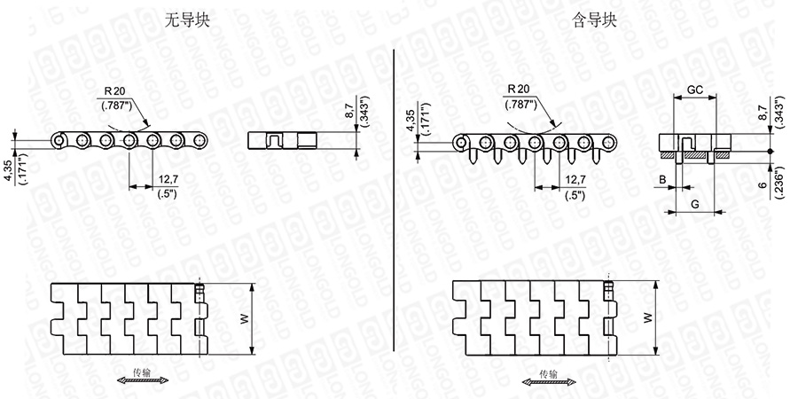 上圖為1/2"節(jié)距鏈板 611系列系列,圖紙中已標(biāo)明部分尺寸。
