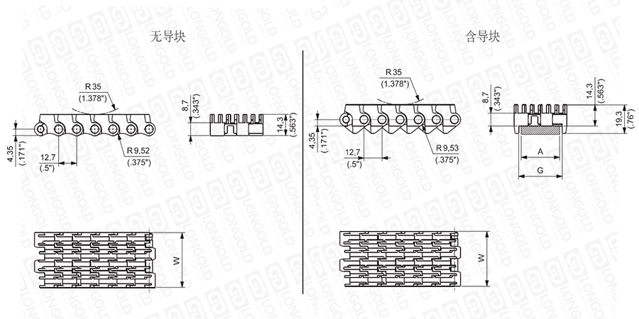 上圖為1/2"節(jié)距鏈板 RR611系列結(jié)構(gòu)圖,圖紙中已標(biāo)明部分尺寸。
