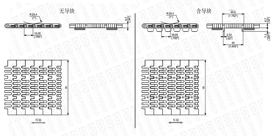 上圖為3/4"節(jié)距中載鏈板 7200系列,圖紙中已標明部分尺寸。