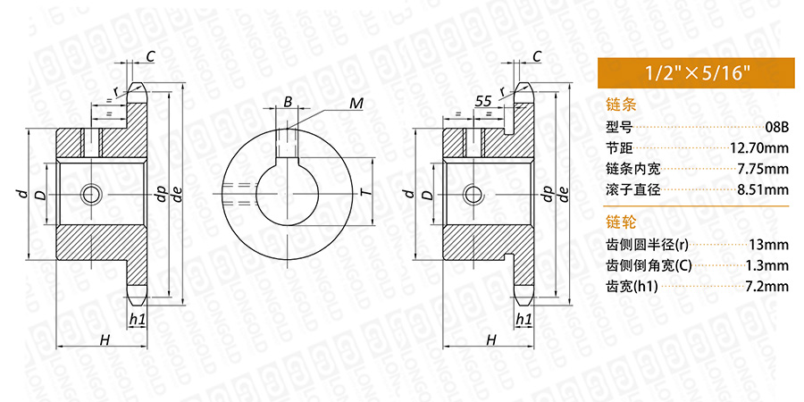 成品孔鏈輪,安裝(聯(lián)結(jié))后無(wú)背隙,由于采用軸向固定,不需要“防止脫落具”,定位準(zhǔn)確,鏈輪孔已經(jīng)加工完成,可直接安裝使用,配用LD08B-1單排鏈條。