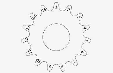 齒數(shù)就是齒輪有多少個(gè)齒的意思,Z表示齒數(shù)。如圖為15齒的齒輪。
