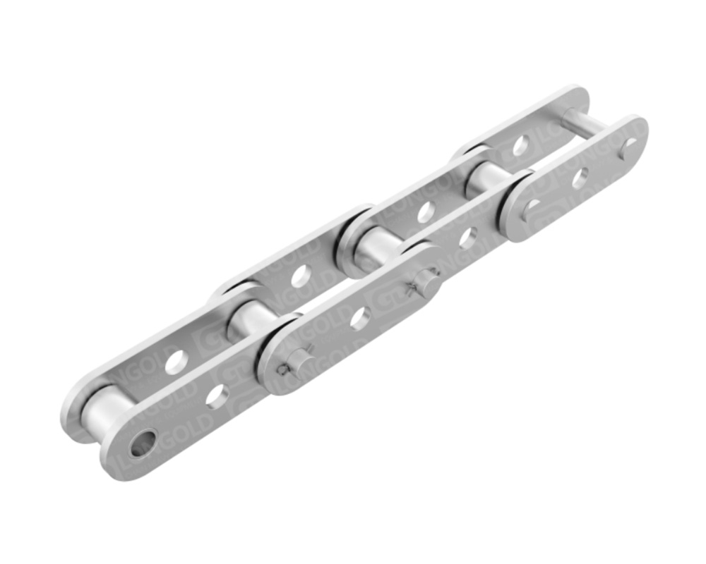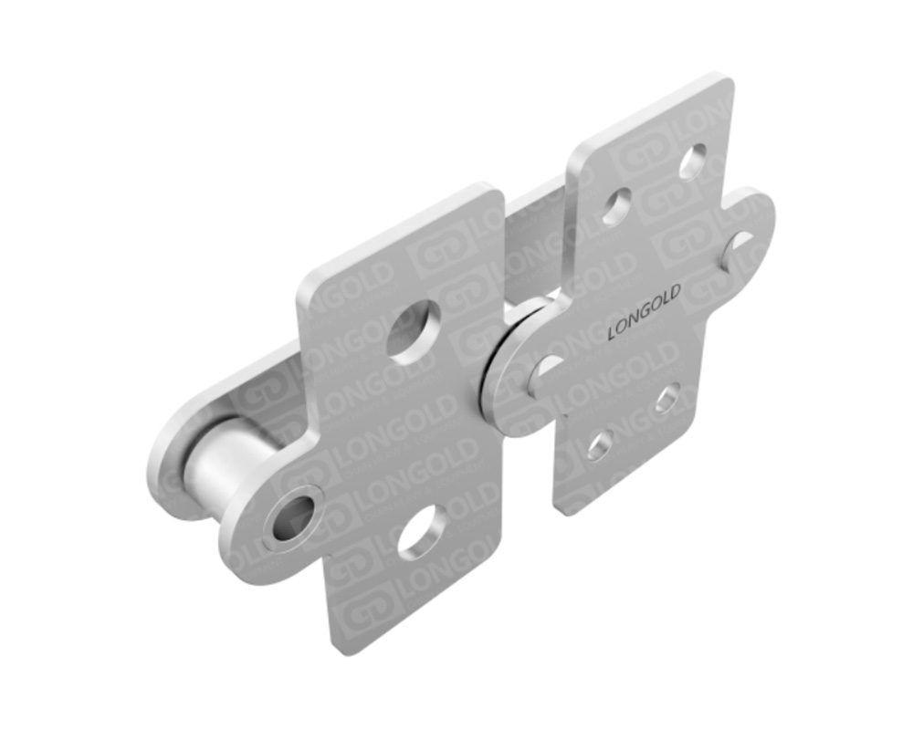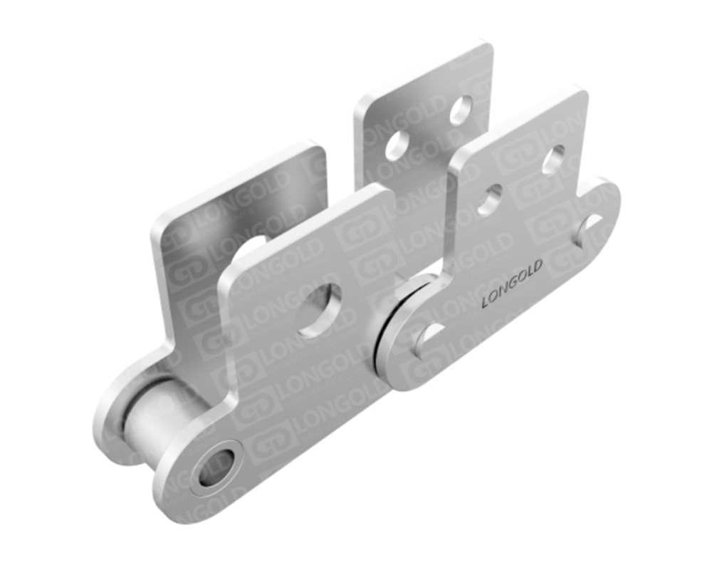 鏈條節(jié)距為標準傳動用滾子鏈的2倍,適用于長距離的物料輸送。不銹鋼鏈條具有良好的耐腐蝕性能??墒褂脺囟葏^(qū)域從-20°C到400°C。鏈條單側鏈板上下延伸,延伸的附板成為附件,附板上帶1個或2個螺孔,附件表示為:SAA1、SAA2。