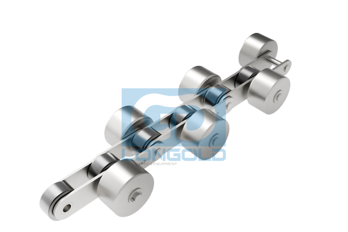 帶側(cè)置滾子鏈條,是延長雙倍節(jié)距或短節(jié)距滾子鏈條的銷軸,然后安裝自由旋轉(zhuǎn)的側(cè)置滾子的輸送鏈條。
