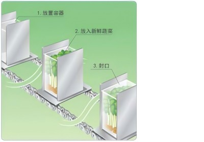 用于新鮮蔬菜包裝機。放置容器~放入新鮮蔬菜~封口,需要數(shù)道工序。間歇搬運,定位精度要求高。 |