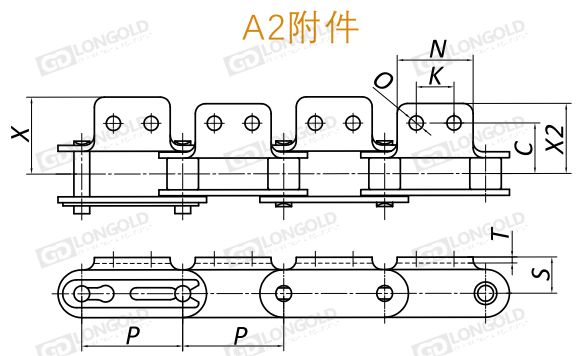A2附件,鏈條單側帶折彎板,且附板上帶兩孔的附件。
