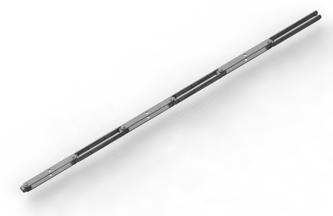 雙鉸接輸送鏈條設(shè)計(jì)用于能夠在空間范圍內(nèi)沿彎曲封閉軌道平穩(wěn)運(yùn)行的輸送系統(tǒng),常見于輕型封閉軌懸掛輸送機(jī)。它的結(jié)構(gòu)允許在多個(gè)方向上靈活移動,適用于復(fù)雜的輸送路線。