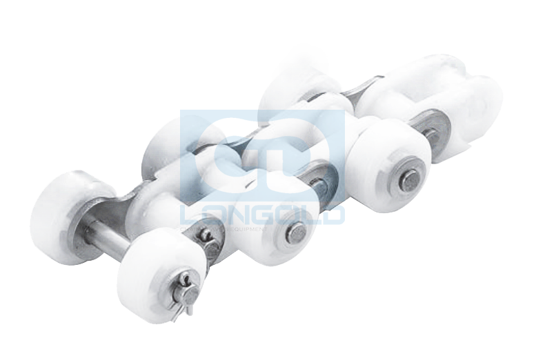 帶側(cè)置滾子鏈條,是延長雙倍節(jié)距或短節(jié)距滾子鏈條的銷軸,然后安裝自由旋轉(zhuǎn)的側(cè)置滾子的輸送鏈條。