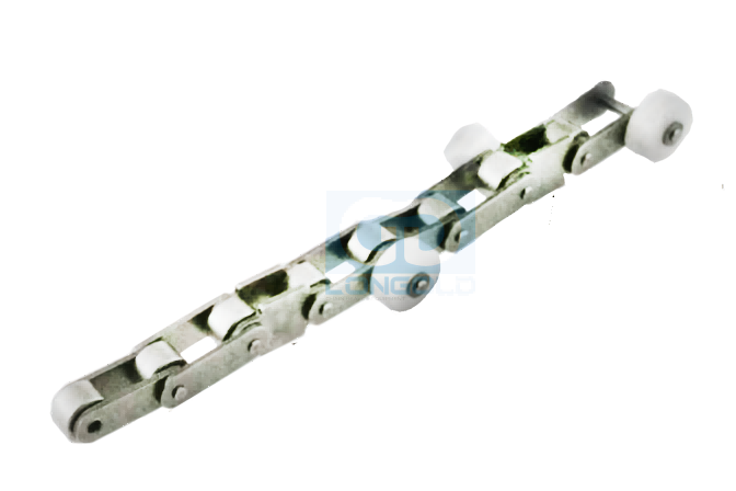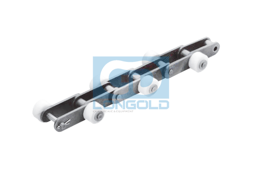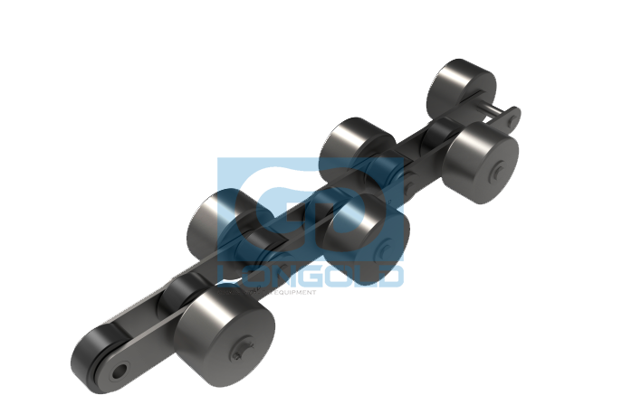 帶側(cè)置滾子鏈條,是延長雙倍節(jié)距或短節(jié)距滾子鏈條的銷軸,然后安裝自由旋轉(zhuǎn)的側(cè)置滾子的輸送鏈條。